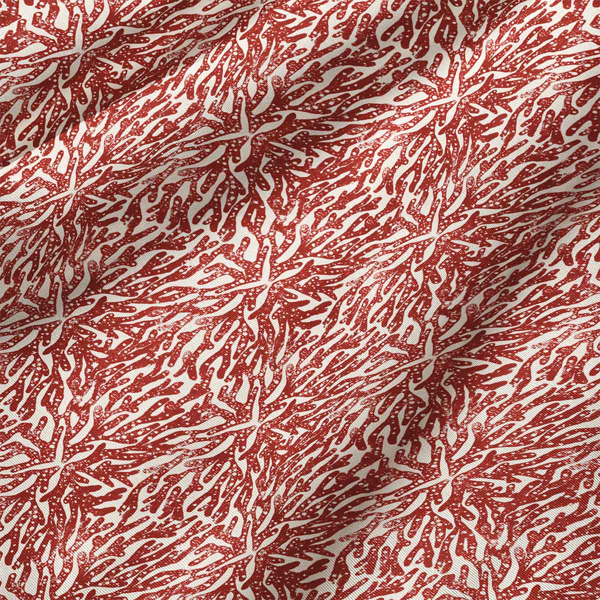 Inspiré d’un été en Méditerranée, ce motif rend hommage au corail rouge de Sardaigne, symbole précieux et fragile de la mer. Gravé à la main et imprimé selon la technique de la linogravure, chaque fragment a été recomposé pour faire perdurer les ramifications du corail, comme figées dans le temps.