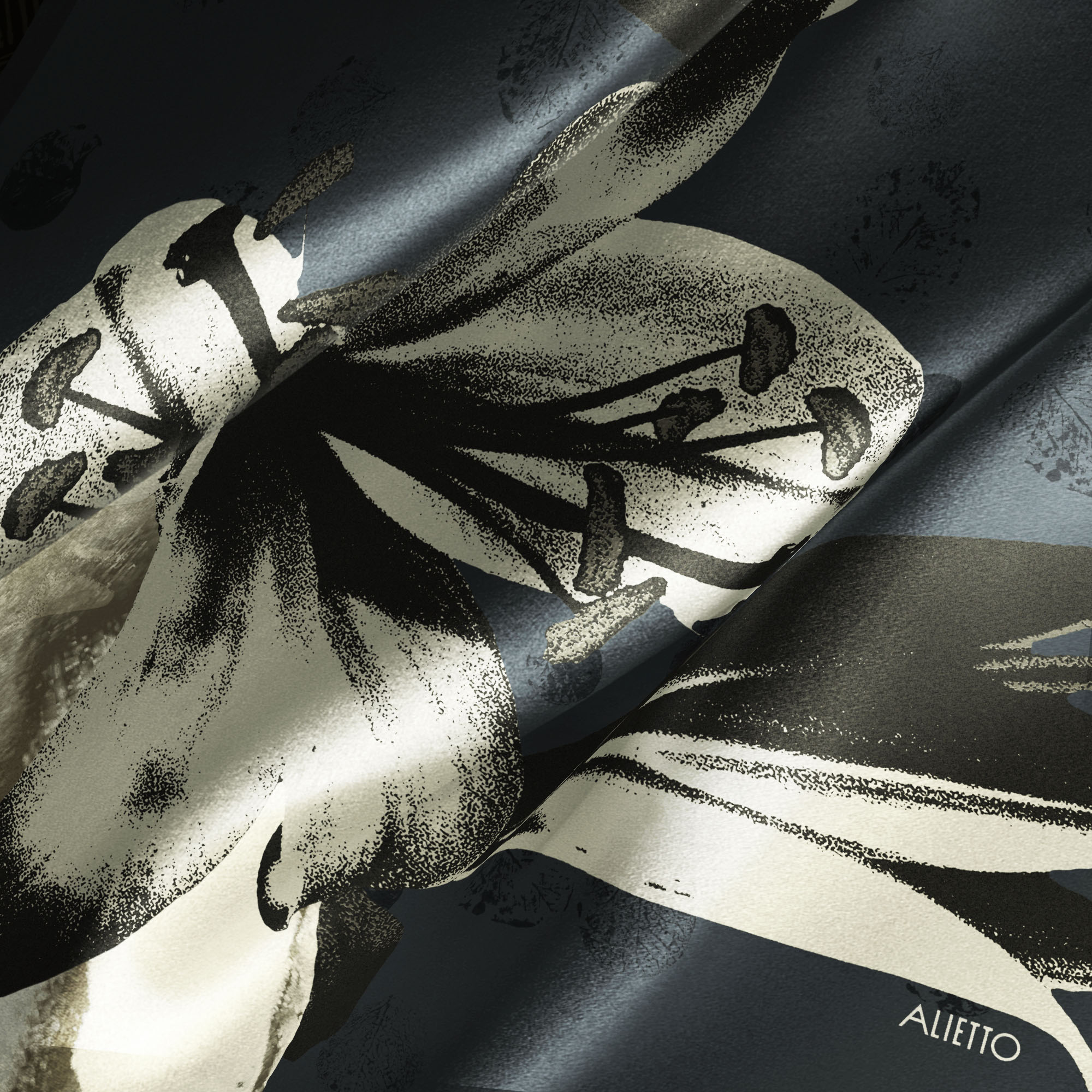 Un univers nocturne aux tonalités bleu nuit. Issu d’un travail de collage à partir de photographies argentiques traité en gravure et de photocopie, un buste féminin se mêle à une orchidée aux allure de bronze. En arrière-plan, un motif d’eucalyptus apparaît en filigrane.